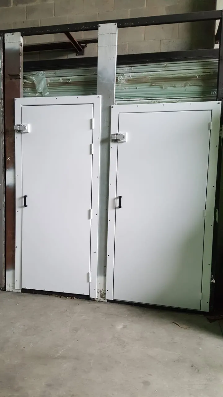 Estrutura em chapa de aço galvanizado ou carbono com pintura industrial, preenchimento com materiais de alta densidade e incombustíveis, vedação com borracha acústica e ferragens reforçadas para uso industrial.